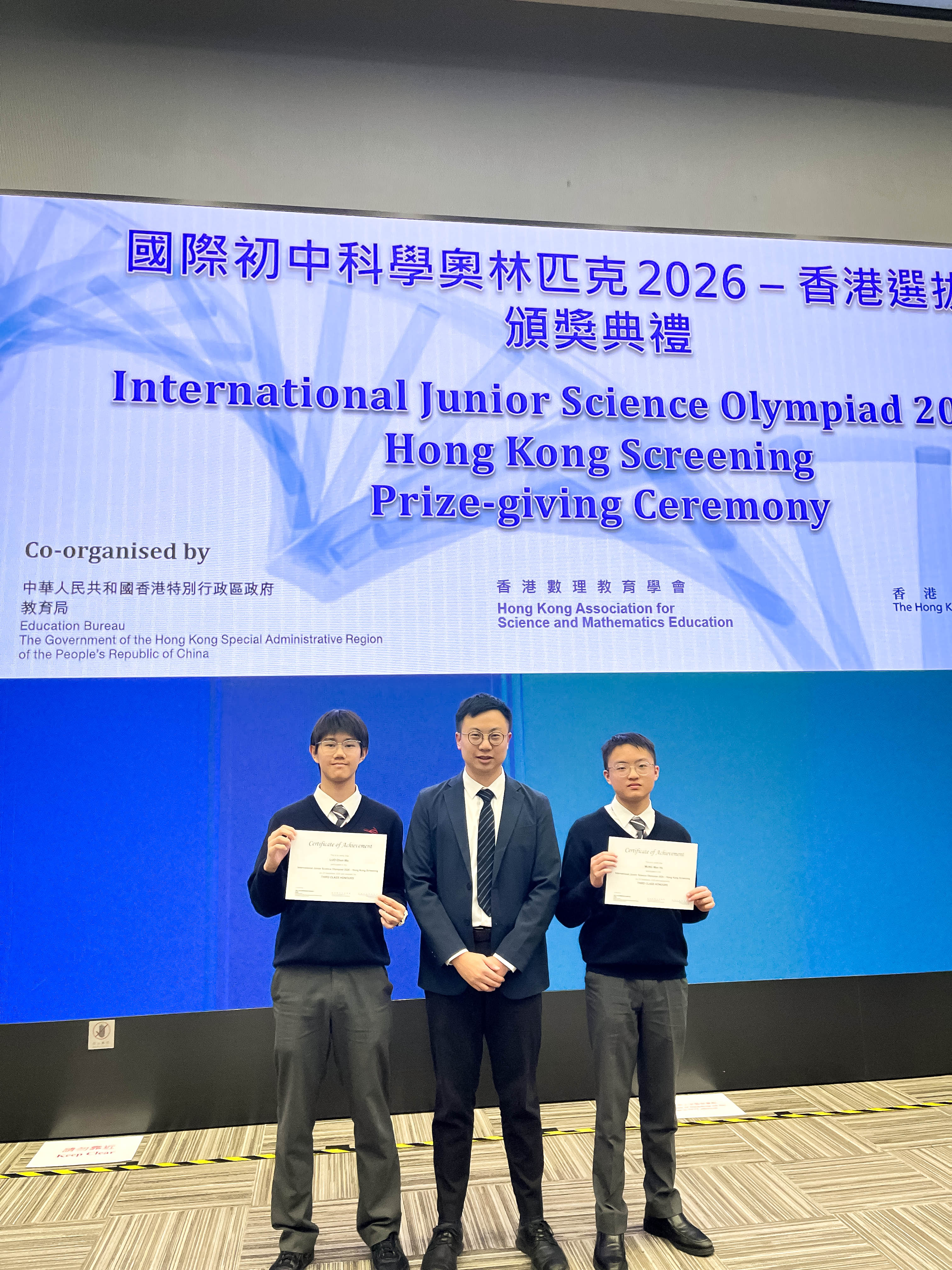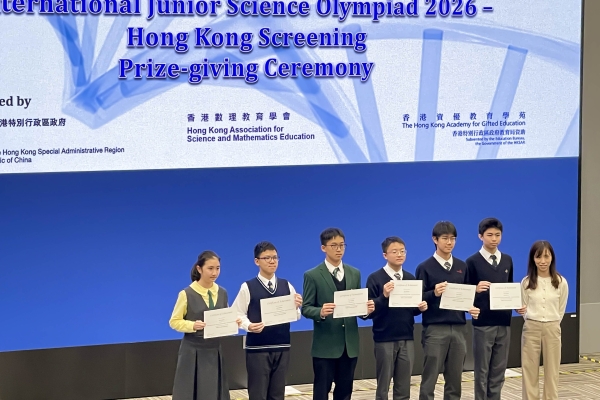 Mr. Luo Chun Wa (3B 17) and Mr. Mung Man Ho (3B 19) have received a Third Class award in the “International Junior Science Olympiad 2026 (Hong Kong Screening) jointly organized by The Gifted Education Section of the Education Bureau, the Hong Kong Academy for Gifted Education and Hong Kong Association for Science and Mathematics Education.